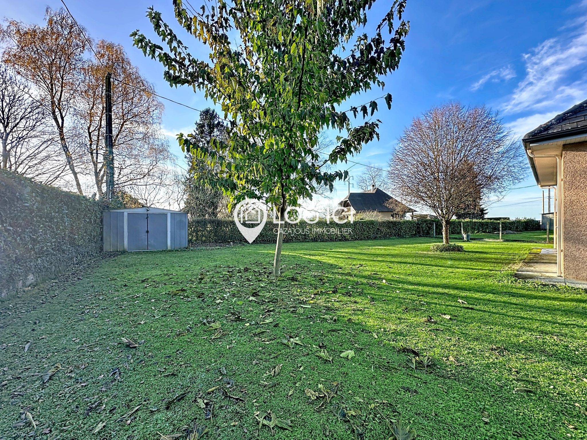 À l’extérieur, le terrain arboré de plus de 1 000 m² vous laisse de la place pour profiter, imaginer un potager… ou simplement le calme.