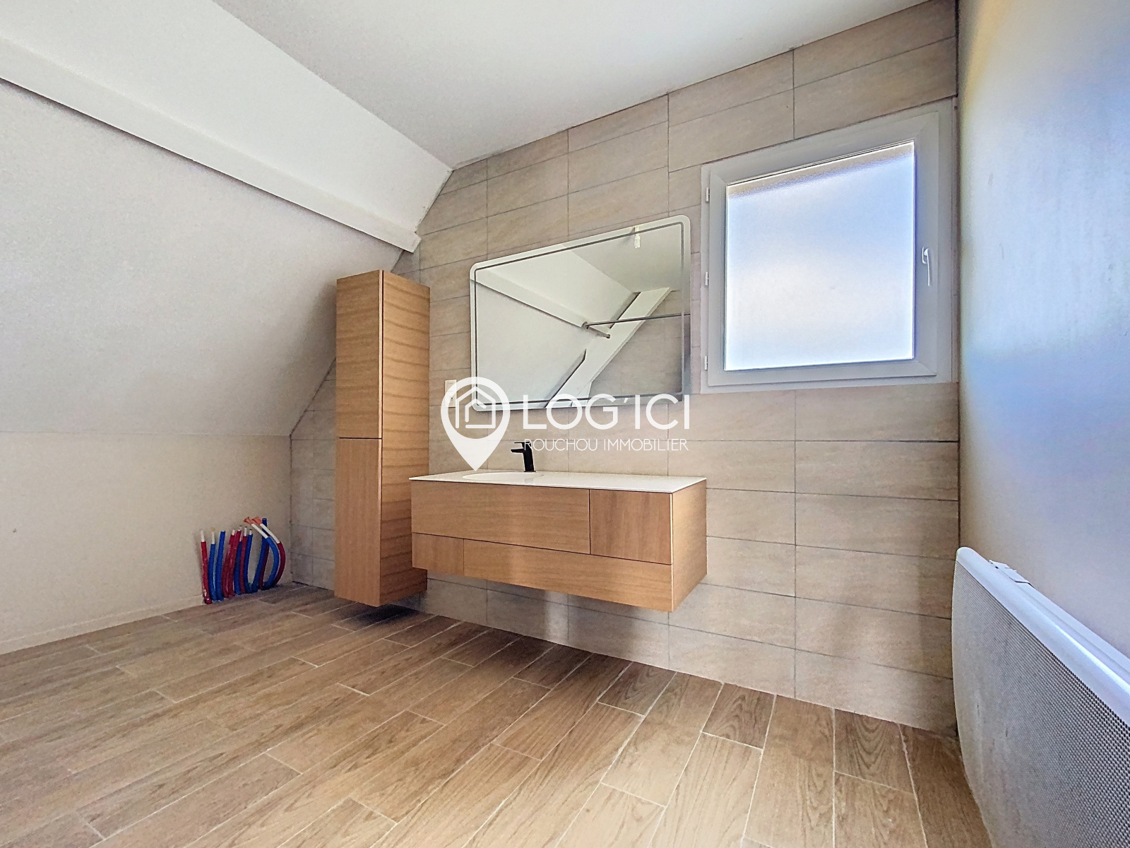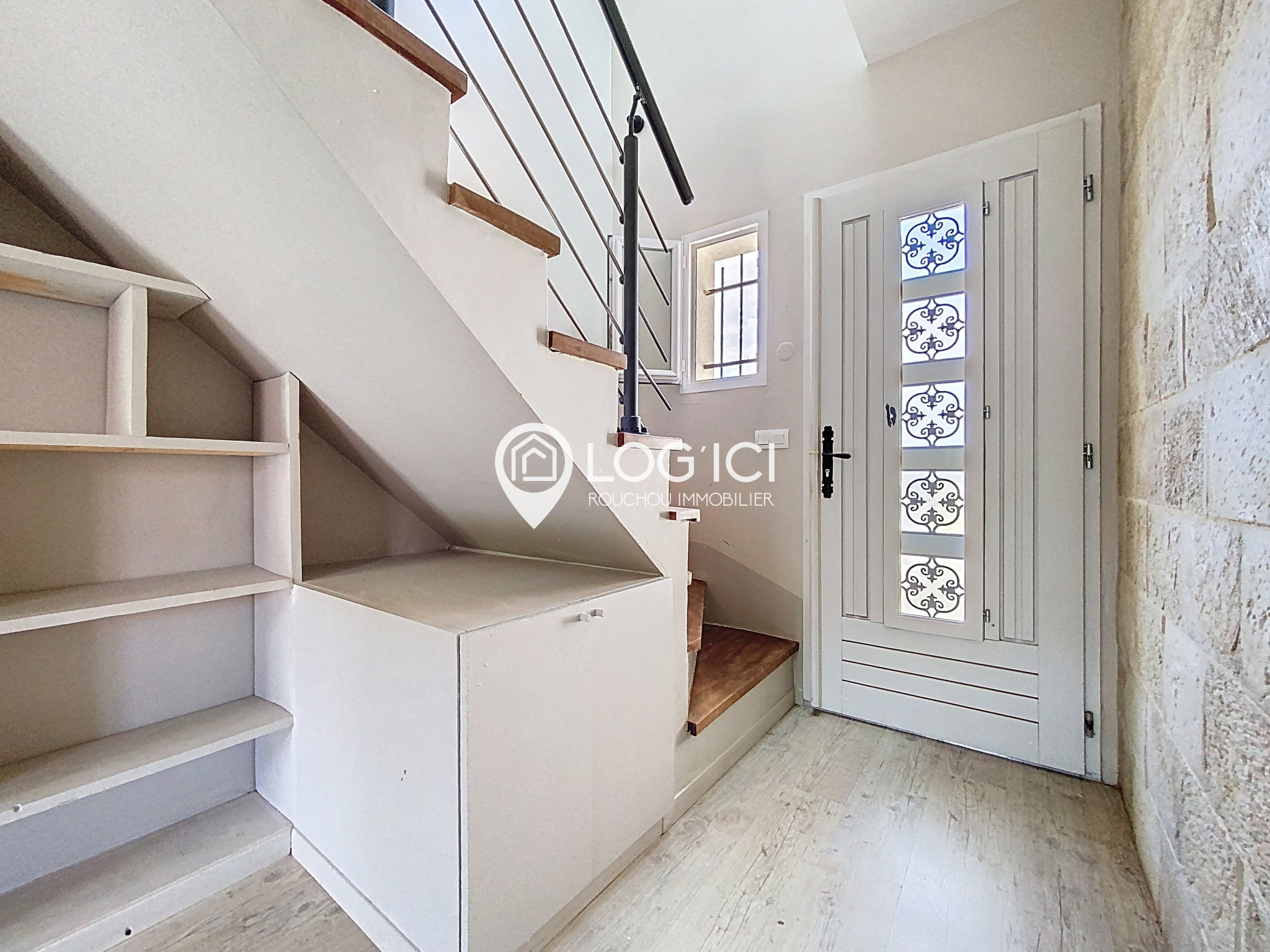 Au rez-de-chaussée : une entrée, un grand espace de vie avec cuisine équipée lumineux, une buanderie, une chambre avec placard et wc.